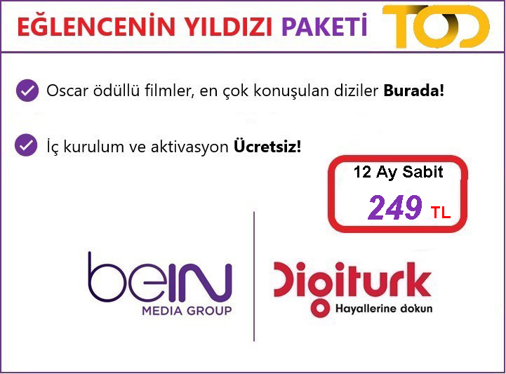 Kampanya 12 ay taahhütle Eğlencenin Yıldızı Paketi’ni kapsar. 12 ay ayda 149 TL bedelle sunulacaktır. Kampanya kapsamında ilk ay Yıldız Dolu Paketi hediyedir. Aktivasyon ve iç kurulum ücretsizdir. İkamet edilen konutun bulunduğu binada ortak Digiturk anteni olmaması halinde ise dış kurulum yapılır. Dış kurulum bedeli 80’lik - 90’lık çanak anten için Digiturk’e 1032 TL olarak ayda 86 TL olmak üzere 12 taksitle veya Digiturk yetkili servisi tarafından kesilen fatura karşılığı, ilgili yetkili servise tek seferde peşin 860 TL olarak ödenebilir. Kurulum hizmetine 20m kablo dahildir. Aboneliğin taahhüt süresi dolmadan iptal edilmesi/kampanya şartlarına aykırı davranış durumunda, iptale kadar geçen süre boyunca sunulan, ücretsiz/indirimli hizmetler BTK’ya uygun şekilde Digiturk tarafından faturalandırılır. Kampanya 3 Mart 2024 tarihine kadar sadece yeni üyeliklerde geçerlidir. Digiturk kanal/ paket içeriğini değiştirme hakkını saklı tutar.