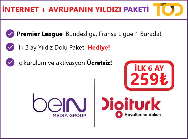 Digiturk İnternet Başvuru Formu Adınız Soyadınız: Telefon Numaranız: Gizlilik ve kullanım koşullarını kabul ediyorum. Tüm Bilgileriniz Digiturk Tarafından Gizli Tutulacaktır. Digiturk Avrupanın Yıldızı + İnternet İlk 2 Ay tüm kanallar Hediye! Ödüllü ve ünlü yönetmenlerin yeni filmleri, ayda 80 dizi ve tam 800 bölümle birlikte, birbirinden popüler ve ödüllü içeriklerin olduğu belgeseler ve çocuk kanalları Premier League, Fransa Ligue 1, Bundesliga, Türkiye Basketbol Ligi ve Spor Toto 1. Lig’in heyecan dolu maçları TOD TV (Bein Connect)'le dilediğiniz zaman dilediğiniz yerde izleme özgürlüğü! İnternet ve Digiturk Aylık Sabit Fiyat ve TEK Fatura! 25900₺ HIZLI BAŞVURU turkcelllilere-ozel-3-ay-ucretsiz-super-paket-kampanyasitransparent600#5e0786 FİYATLARAVANTAJLAR HIZ ALTYAPI TÜRÜ İLK 6 AY KALAN AYLAR 8 MBPS ADSL 259,00 TL 319,00 TL 10 MBPS ADSL 259,00 TL 319,00 TL 16 MBPS ADSL 259,00 TL 319,00 TL 20 MBPS VDSL-Fiber 259,00 TL 319,00 TL 24 MBPS VDSL-Fiber 259,00 TL 359,00 TL 35 MBPS VDSL-Fiber 259,00 TL 399,00 TL 50 MBPS VDSL-Fiber 259,00 TL 439,00 TL 100 MBPS VDSL-Fiber 259,00 TL 479,00 TL Kampanya Bilgileri Kampanya kapsamında belirtilen fiyatlar 3 Ekim 2023 tarihine kadar 12 ay kullanım sözlü İnternetli Avrupanın Yıldızı Paketi için geçerlidir. Kampanya kapsamında İnternetli Avrupanın Yıldızı uydu paketi ve 16 Mbps’ye kadar limitsiz internet ilk 6 ay ayda 259TL, kalan aylar ayda 319TL olarak faturalandırılacaktır. Aktivasyon ve iç kurulum ücretsizdir. İkamet edilen konutun bulunduğu binada ortak Digiturk anteni olmaması halinde ise dış kurulum yapılır. Dış kurulum bedeli 80’lik - 90’lık çanak anten için Digiturk’e 1032 TL olarak ayda 86 TL olmak üzere 12 taksitle veya Digiturk yetkili servisi tarafından kesilen fatura karşılığı, ilgili yetkili servise tek seferde peşin 860 TL olarak ödenebilir. Digiturk kanal/paket içeriğini değiştirme hakkını saklı tutar.
